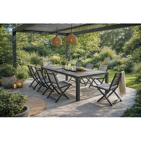 Optez pour un mobilier élégant, moderne et ultra fonctionnel avec cet ensemble de jardin extensible composé d’une table en aluminium noir mat avec plateau HPL Silverstar ciment et 8 chaises pliantes NILS en aluminium noir mat, revêtement textilène gris lin. Idéal pour recevoir en toute simplicité, cet ensemble design s’intègre parfaitement sur une terrasse, sous une pergola ou même en intérieur.