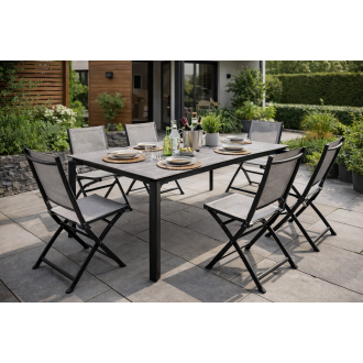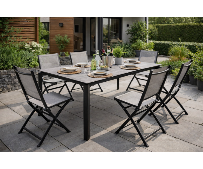 Les chaises NILS, en aluminium noir mat avec assise en textilène coloris gris lin, offrent un excellent confort tout en garantissant tenue, élégance et facilité d’entretien. Un ensemble complet, moderne et fonctionnel pour créer un coin repas extérieur convivial, design et durable sur votre terrasse, jardin ou sous votre pergola.